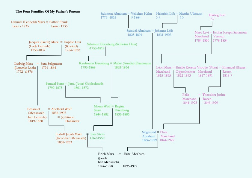 I have been writing about four groups of families with the intention of bringing them all up to the period of the Second World War. We are not quite there yet but almost! The tree below shows how branches of four families join at my paternal grandparents, Erna Abraham and Erich Marx. This family will take up the story next and the stories will widen again across many of the descendants of these four families. For the pedants, there are actually five given that my great grandfather Ludwig’s mother, Adelheid Marx, after the death of her husband Emanuel Marx, remarried to Simon Holländer.